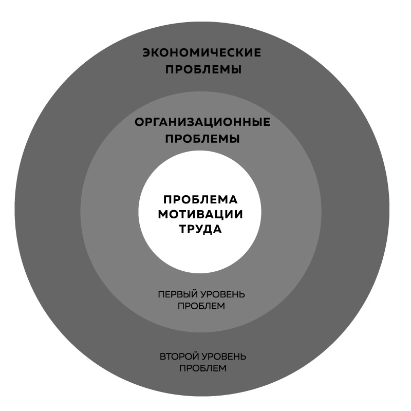 Второй (экономический) уровень проблем самый актуальный для руководителей предприятий. Их решение — вопрос выживания компаний. Поэтому руководители вынуждены в первую очередь решать экономические проблемы, которые являются следствием нерешенности проблем первого уровня, которые, в свою очередь, порождены нерешенностью проблемы мотивации персонала. Наличие проблем второго уровня невозможно устранить, так как они являются симптомами нерешенности проблемы мотивации. Когда решается любая из экономических проблем, на ее месте появляется новая. И так до бесконечности, пока предприятие не придет к банкротству. То есть проблема мотивации — это очень коварная проблема. Она скрыта от руководителей за двумя уровнями проблем, которые они вынуждены решать в первую очередь. Времени на осознание первопричины этих проблем и осознание нетривиальности решения проблемы мотивации у руководителей просто нет. Они начинают использовать классические системы оплаты и стимулирования персонала (повременно-премиальную, KPI, сдельную), которые не способны решить эту непростую задачу и, как следствие, не дают ожидаемого результата. Такое решение под силу только научной мотивации труда.