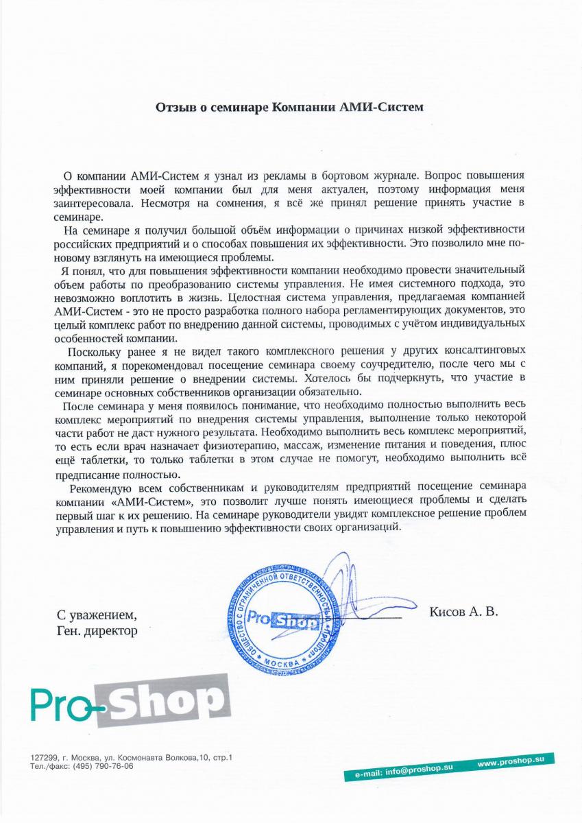 Отзыв генерального директора ООО «Pro-Shop» Кисова А.В.