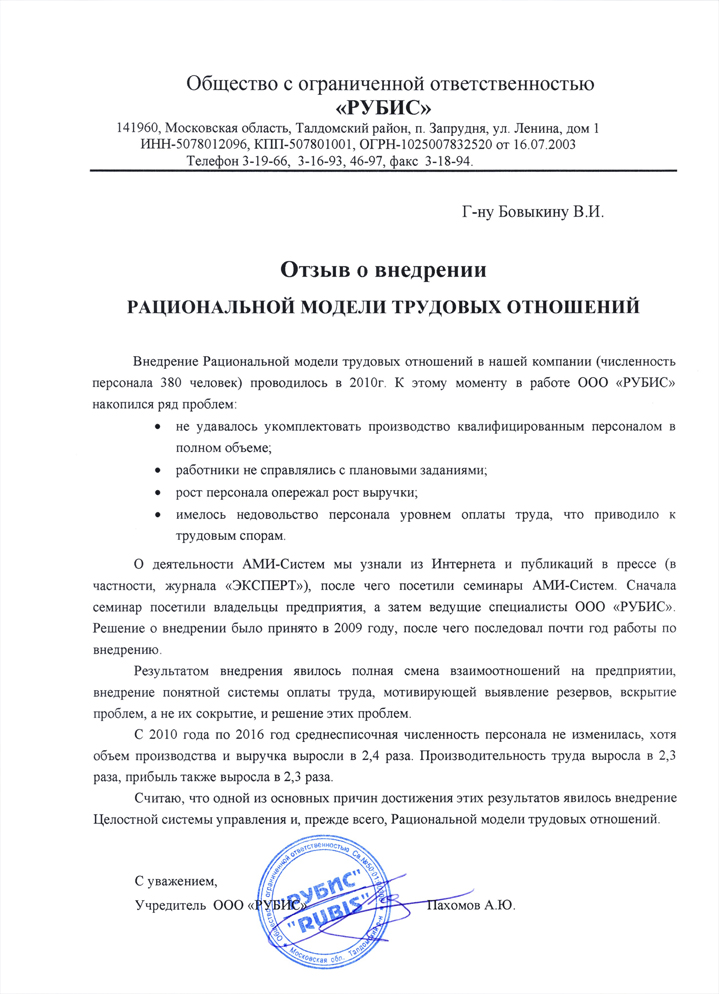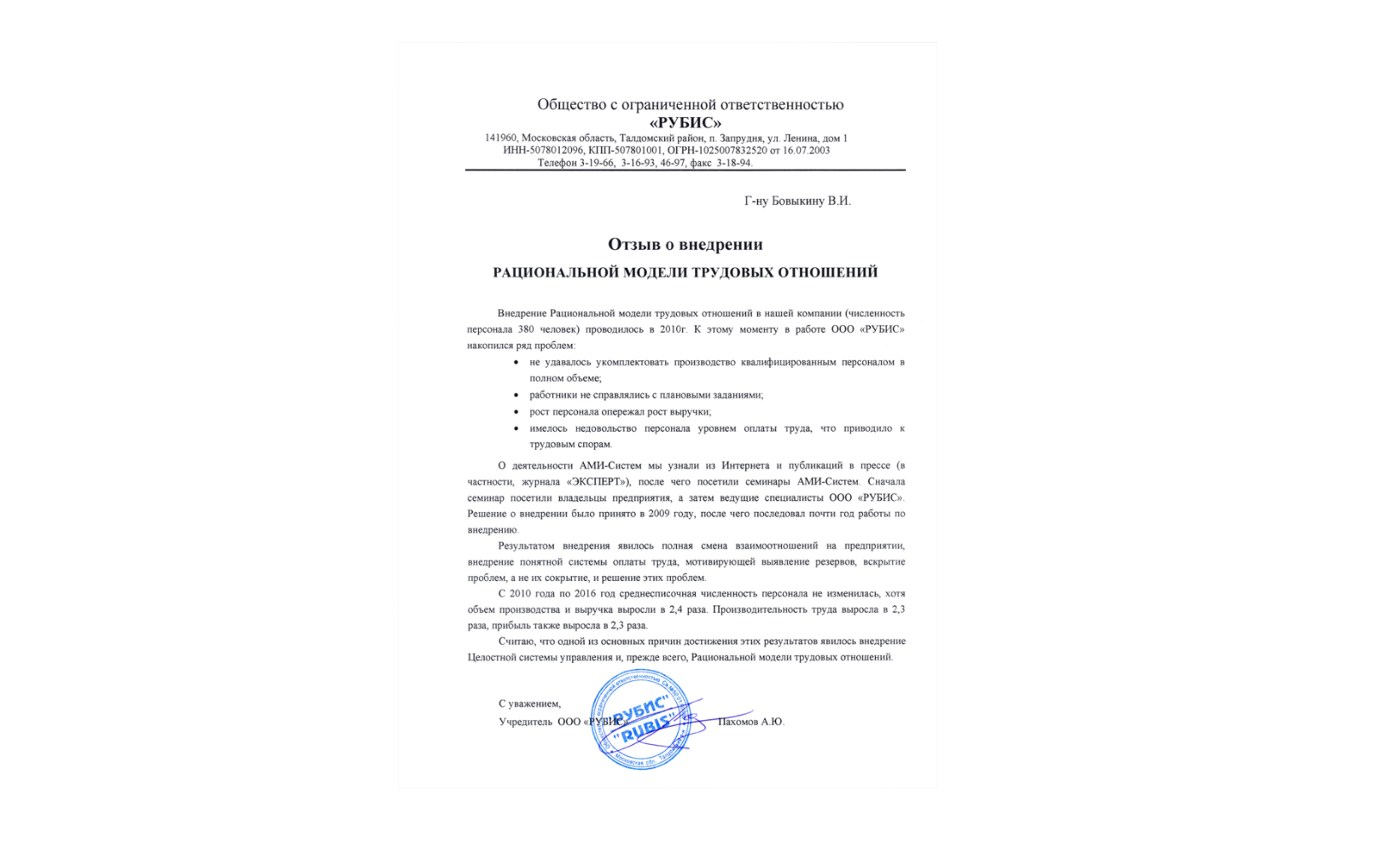 Отзыв ООО «РУБИС» о внедрении Рациональной модели трудовых отношений