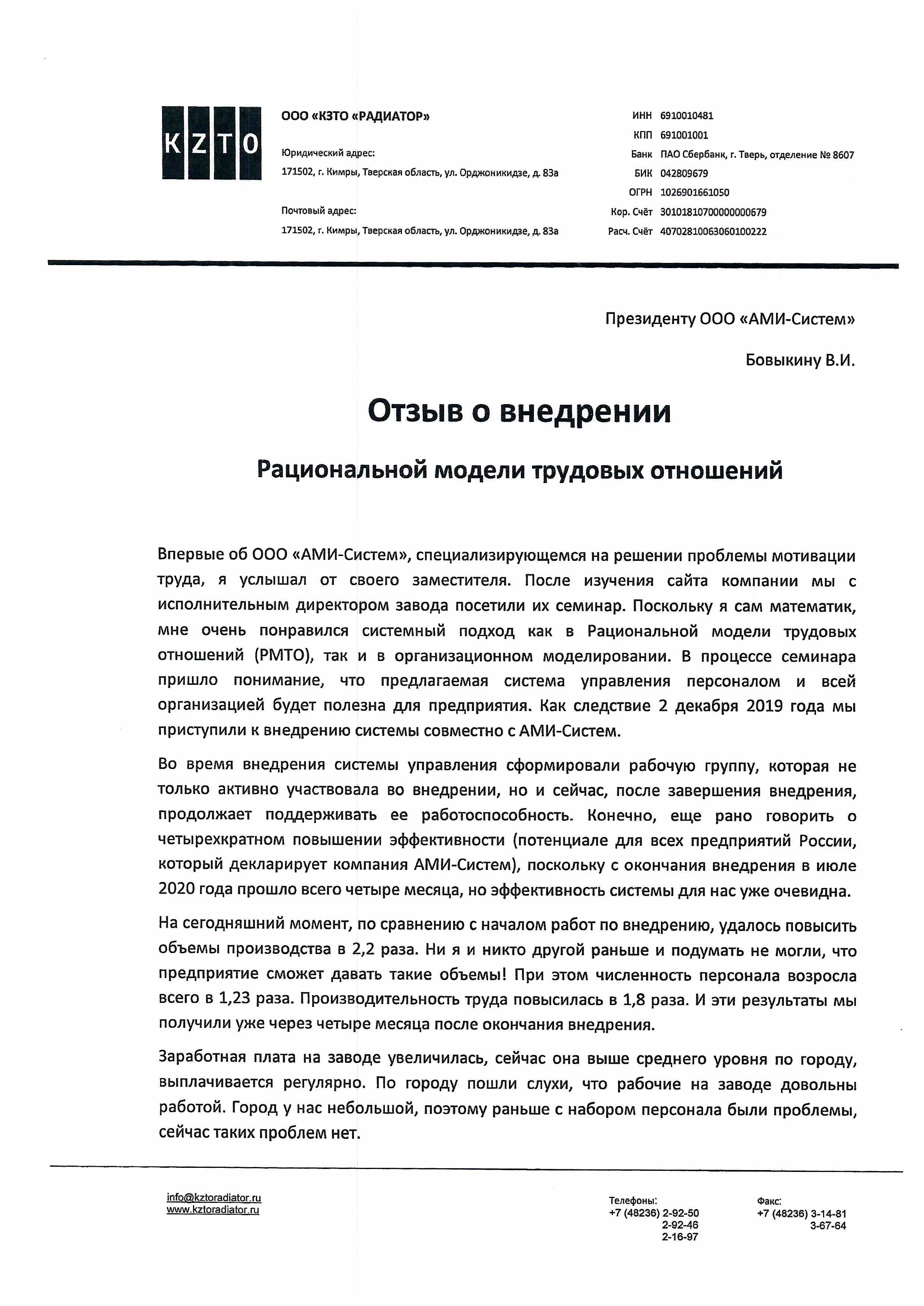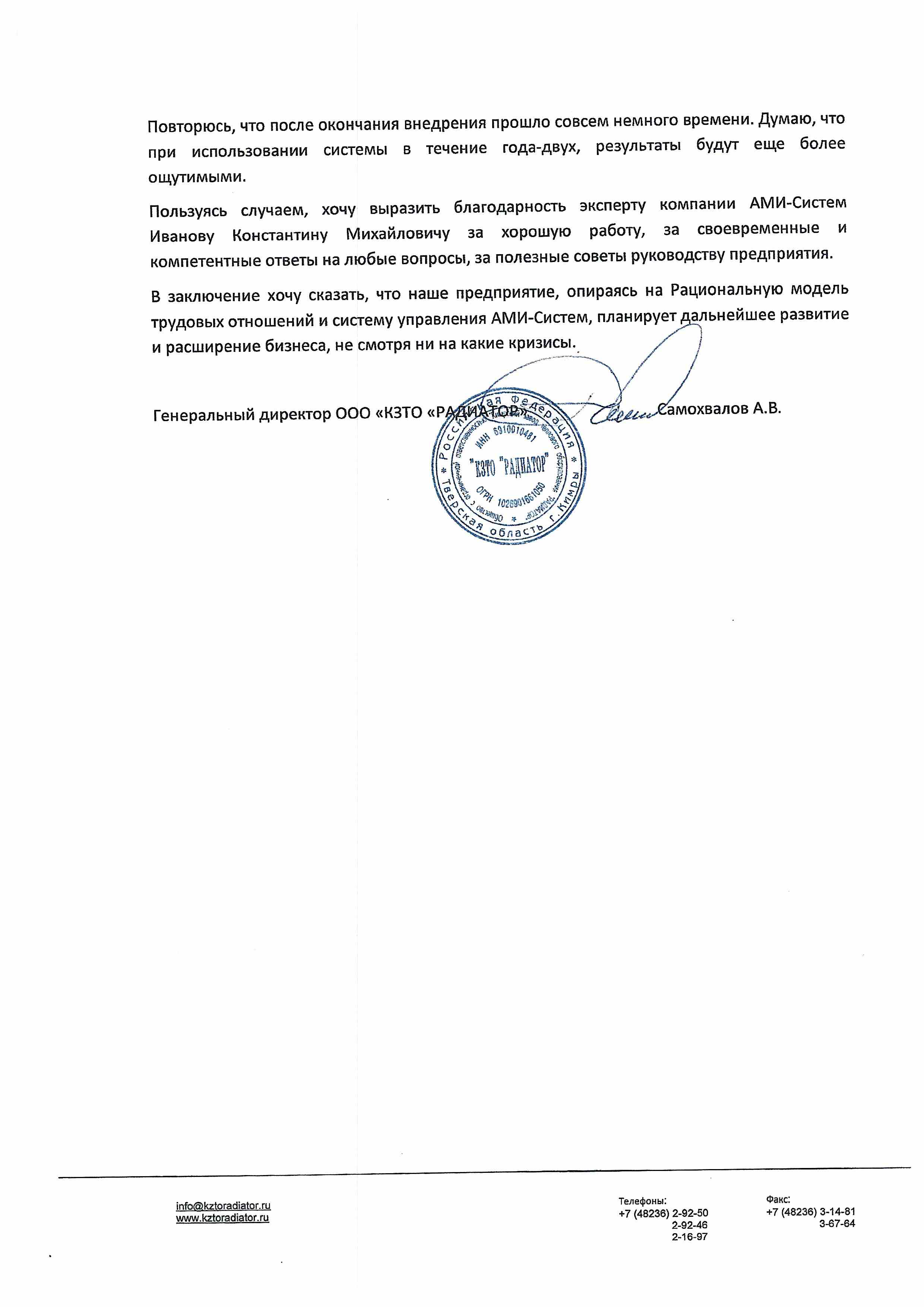 Отзыв Генерального директора ООО «КЗТО «РАДИАТОР» Самохвалова А.В. по результатам внедрения Рациональной модели трудовых отношений