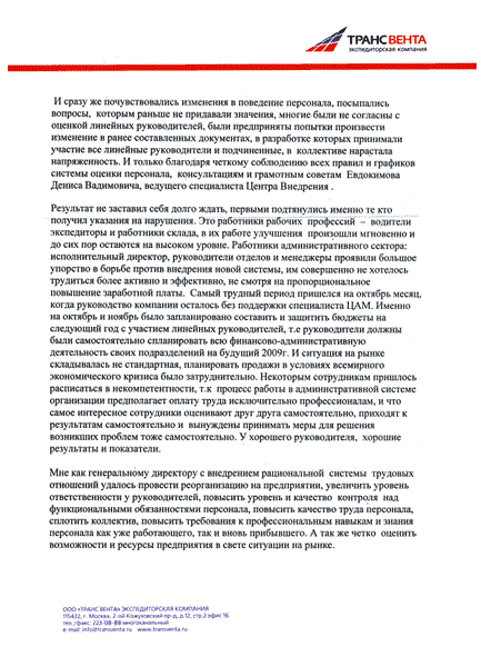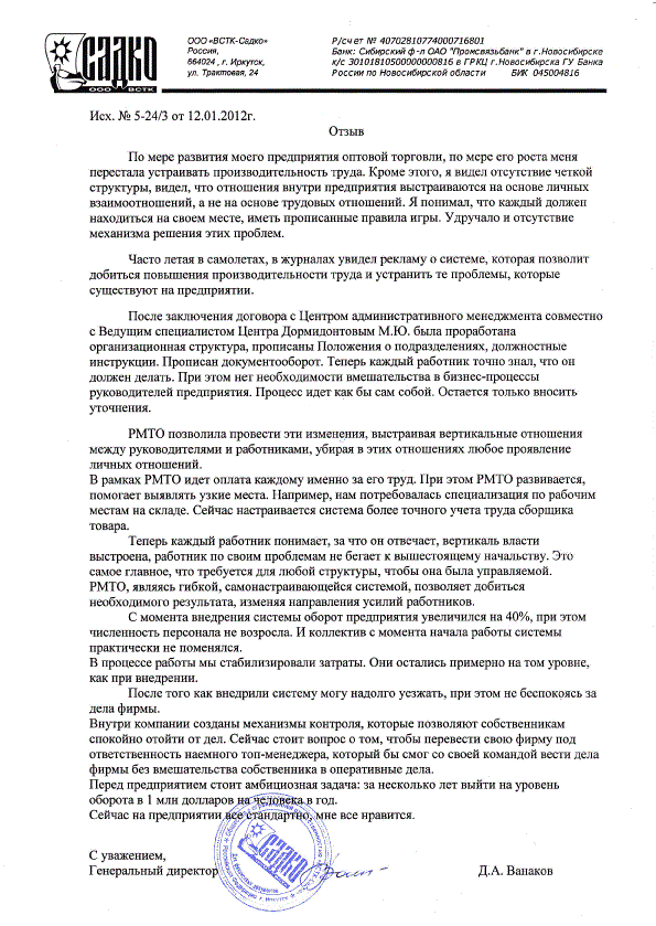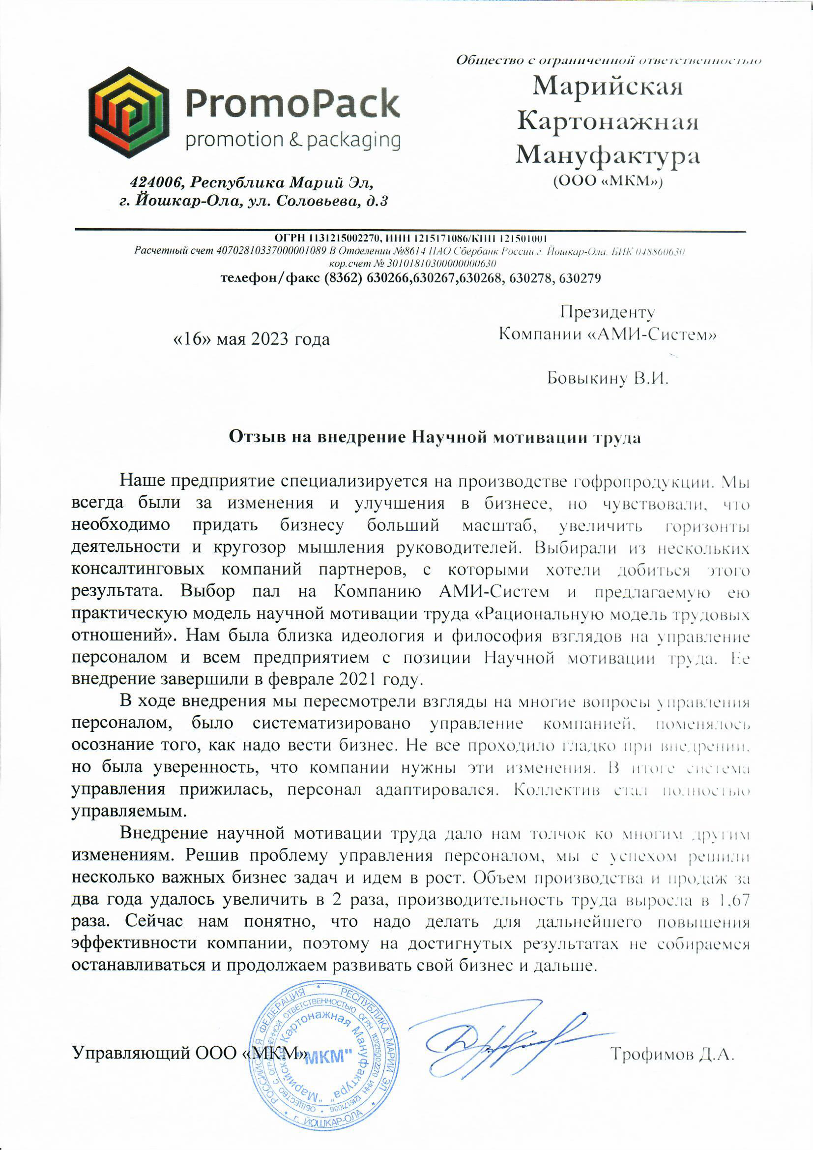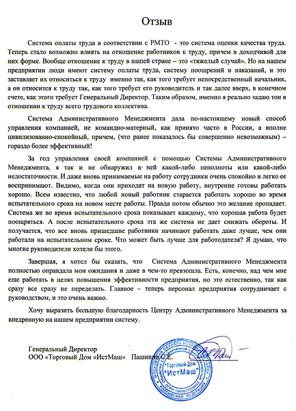Отзыв Управляющего ООО «МКМ» Трофимова Д.А. о внедрении Научной мотивации труда