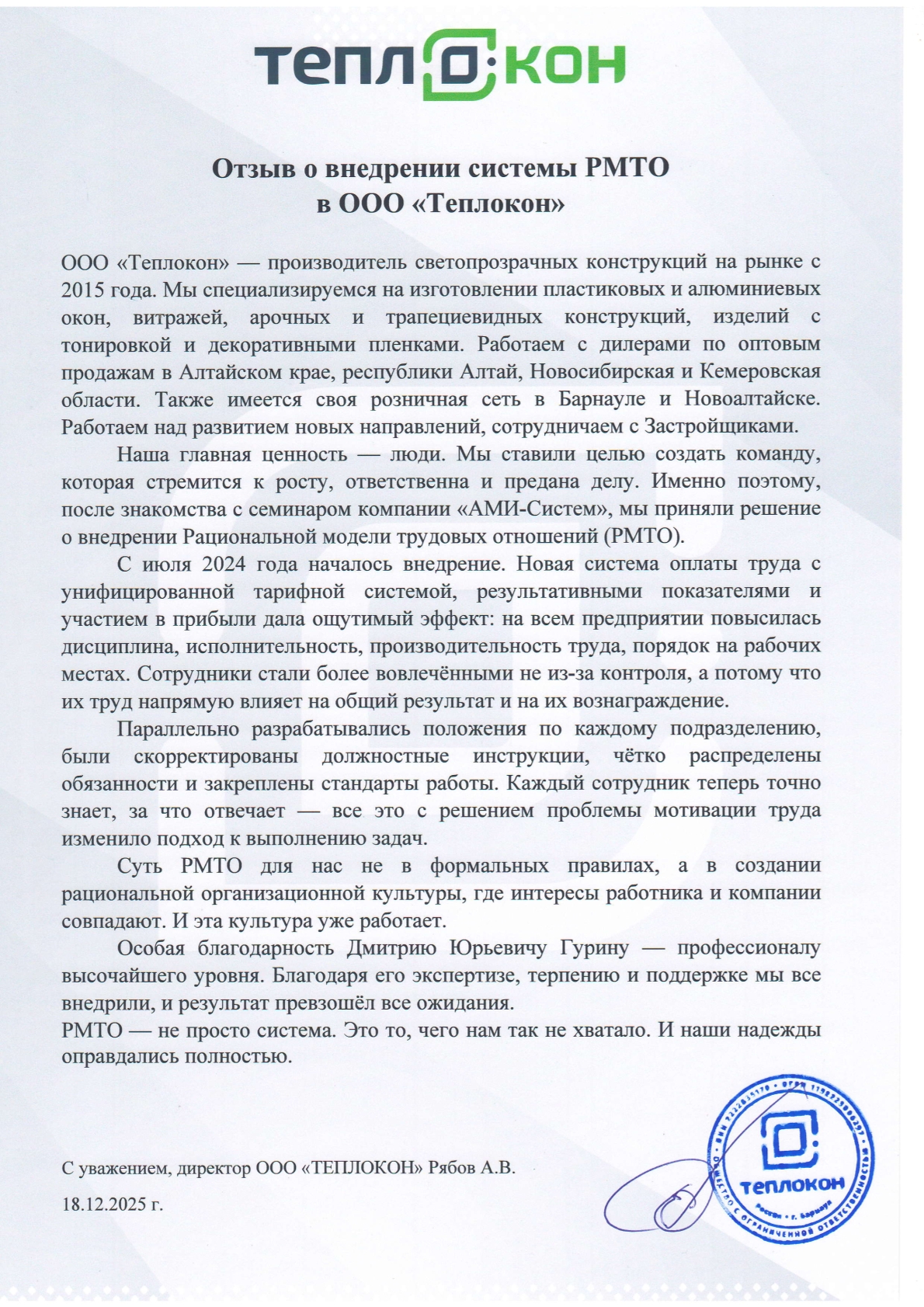 Отзыв директора OOO «Теплокон» Рябова A.B. о внедрении системы РМТО