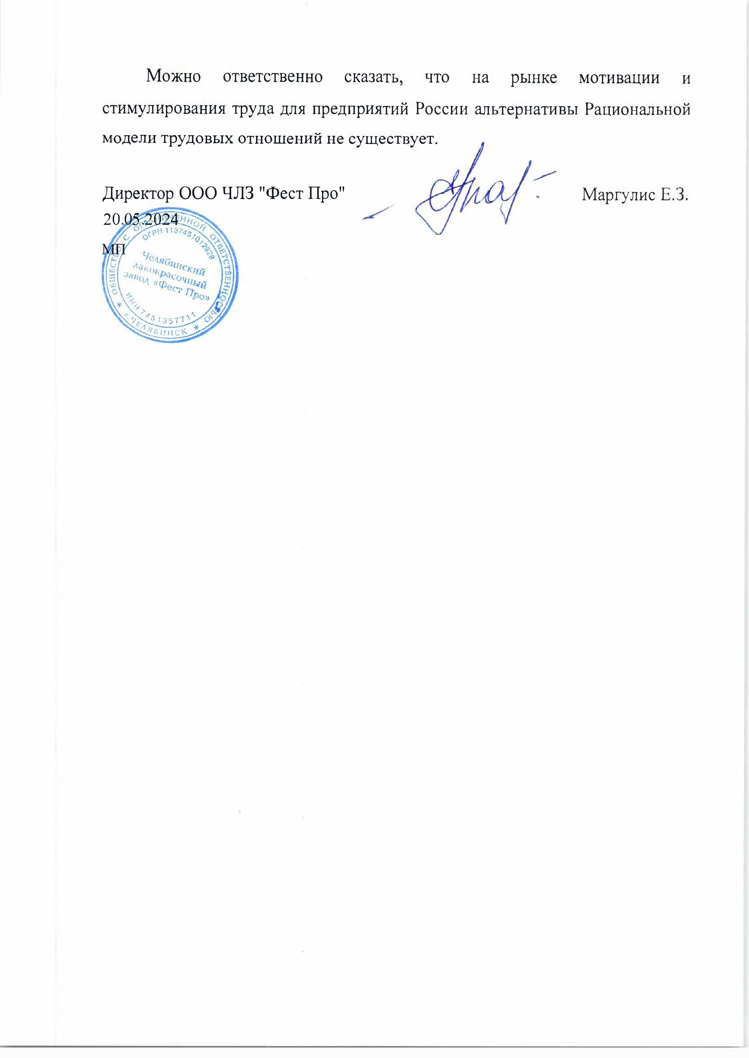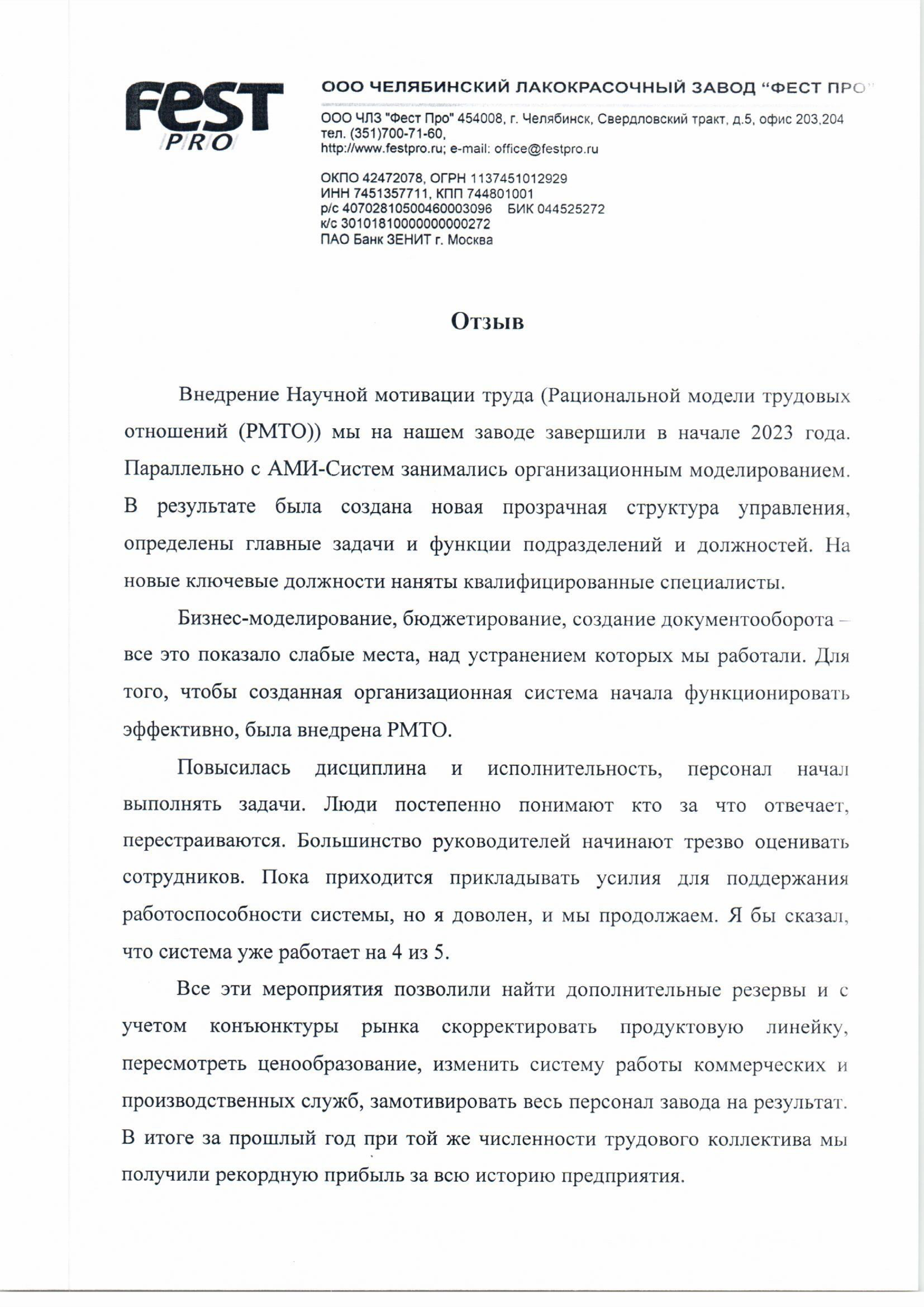 Отзыв директора ООО ЧЛЗ "ФЕСТ ПРО" Маргулиса Е.З. о внедрении Научной мотивации труда