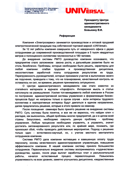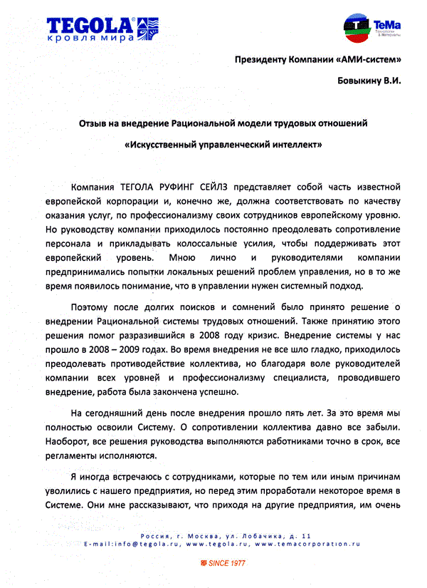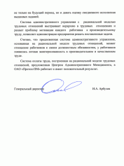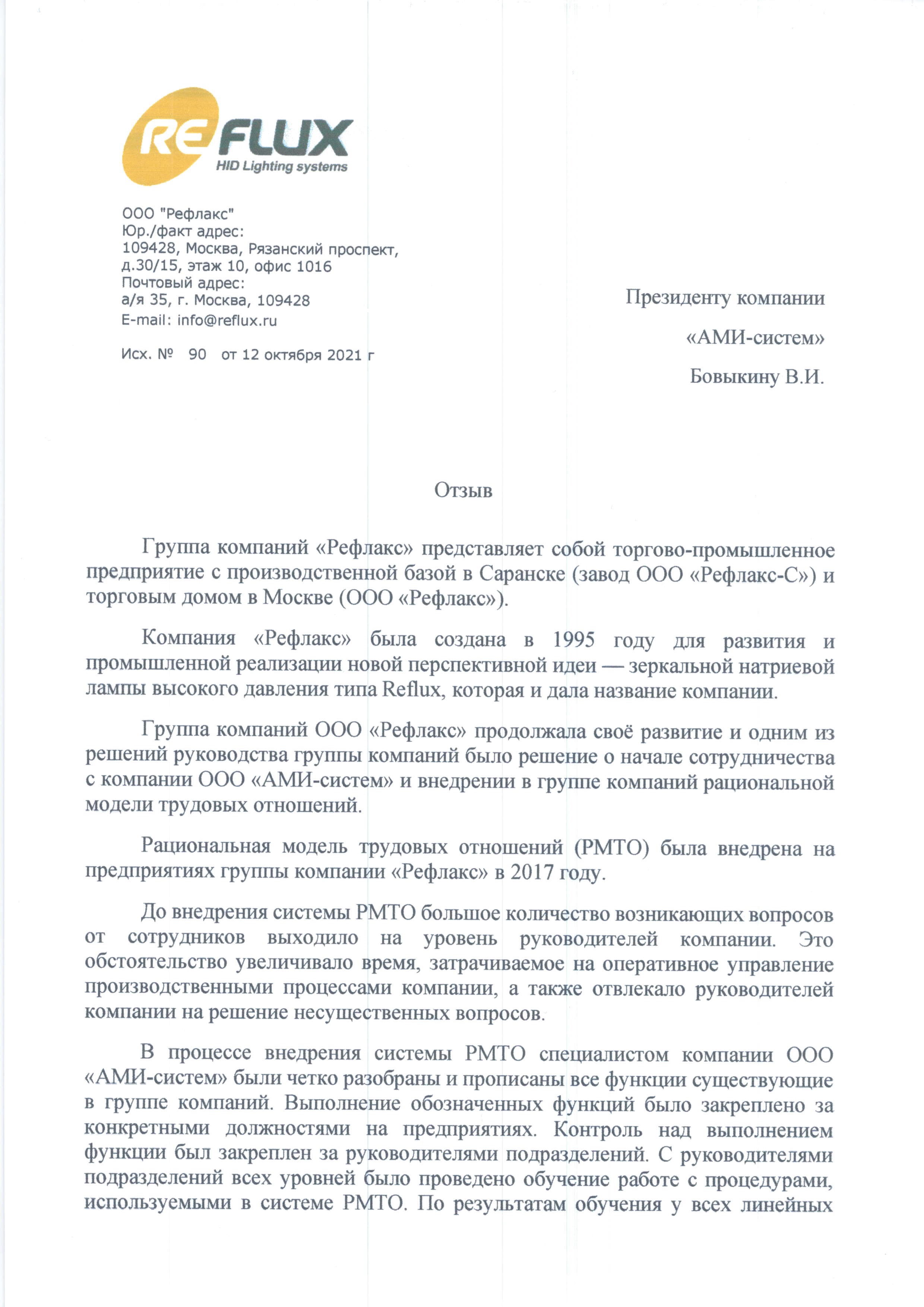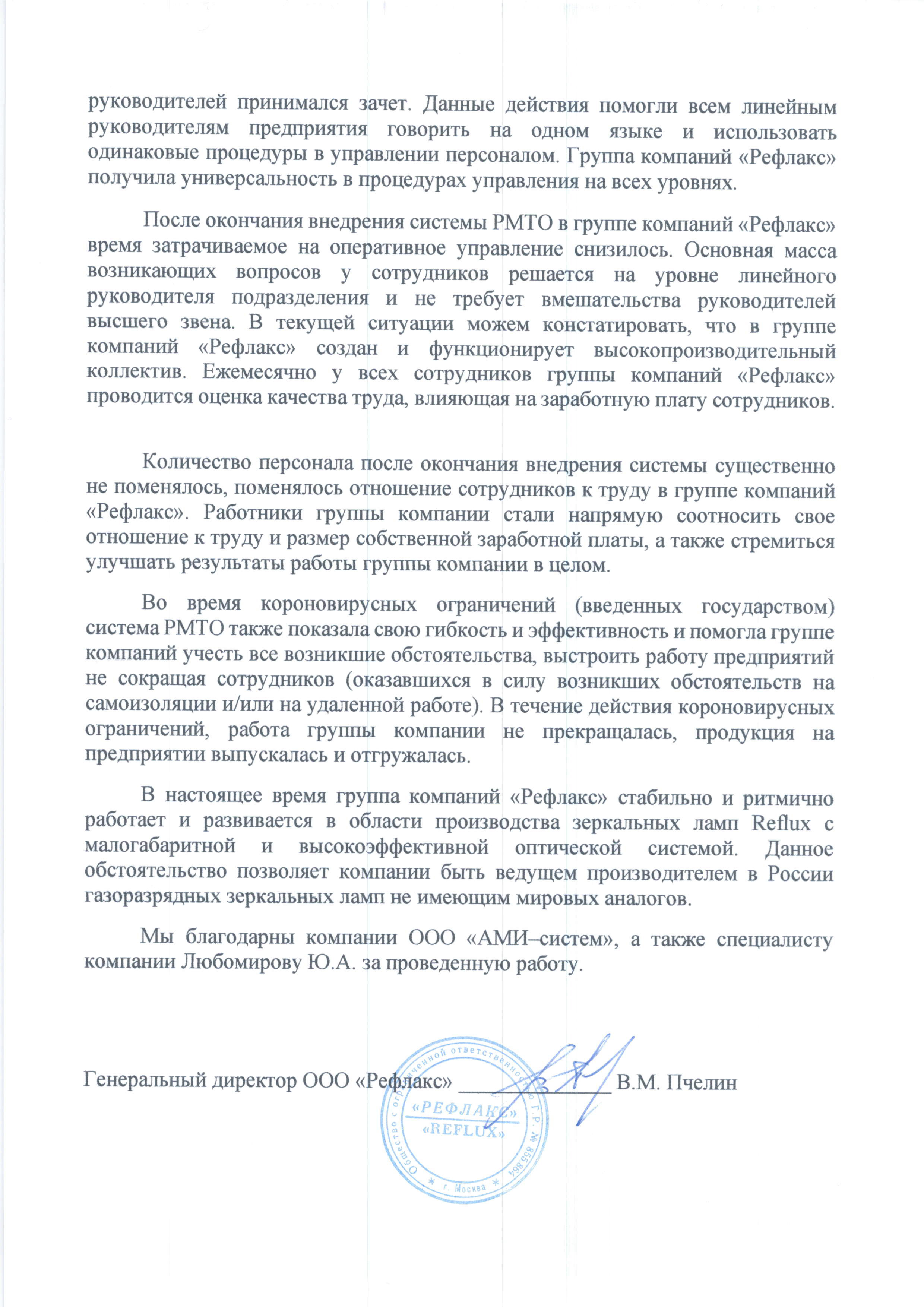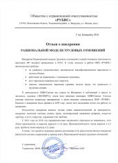 Отзыв Генерального директора ООО «Рефлакс» Пчелина В.П. о внедрении рациональной модели трудовых отношений
