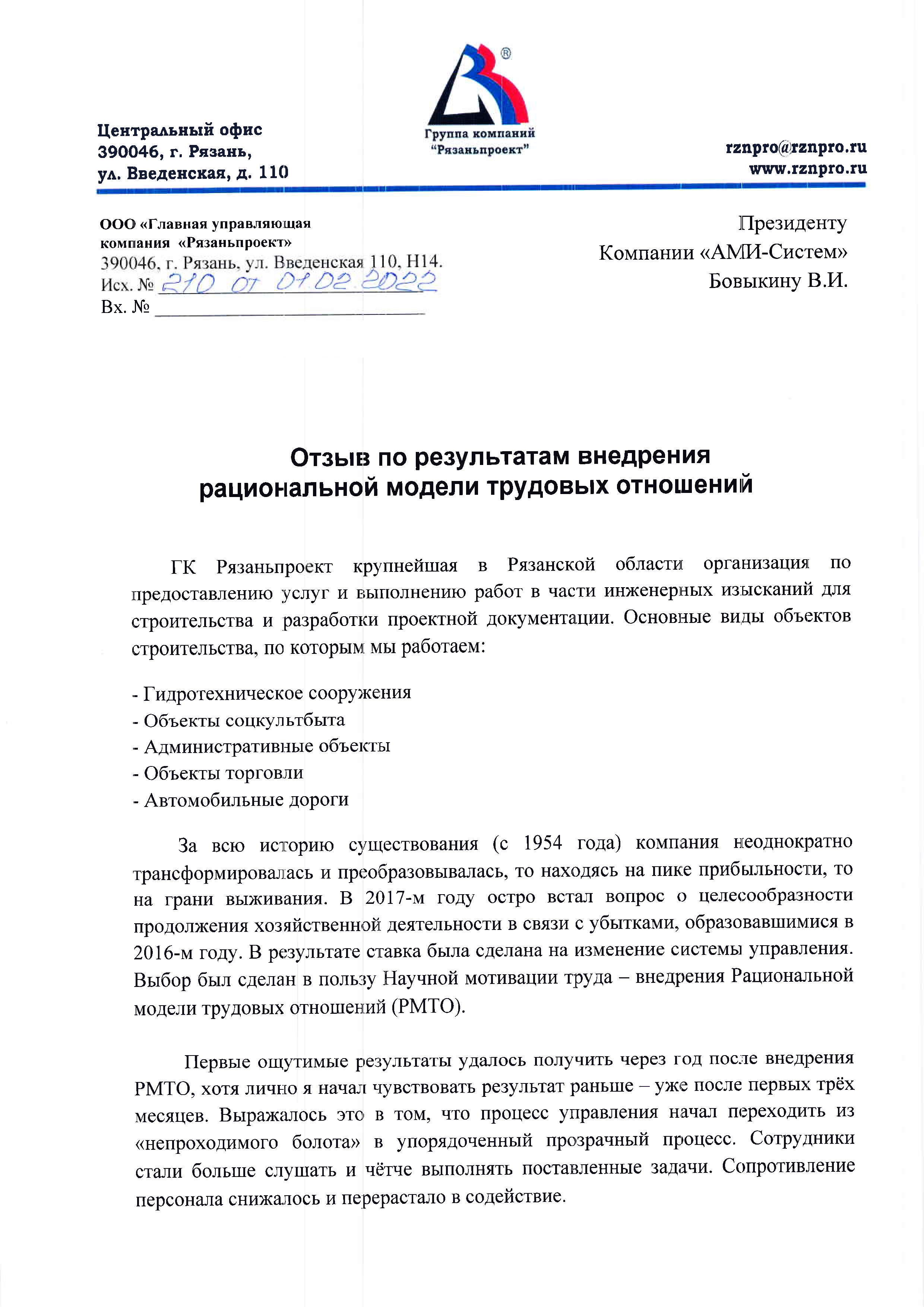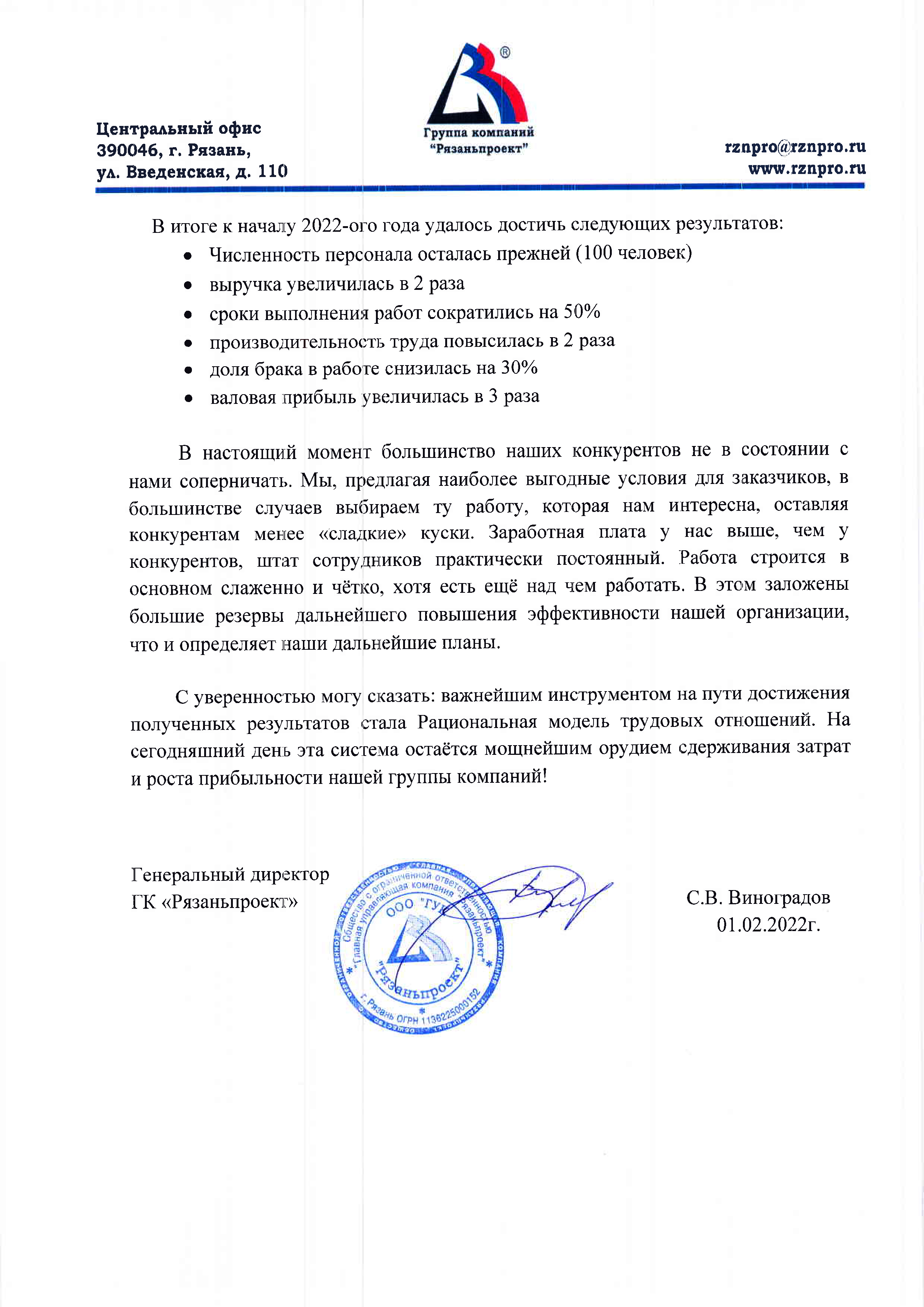 Отзыв Генерального директора ГК «Рязаньпроект» Виноградова С.В. по результатам внедрения Рациональной модели трудовых отношений