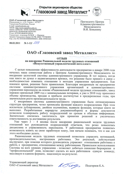 Отзыв управляющего директора ОАО «Глазовский завод Металлист» Подгорнова К.А.