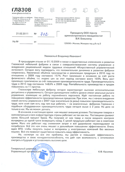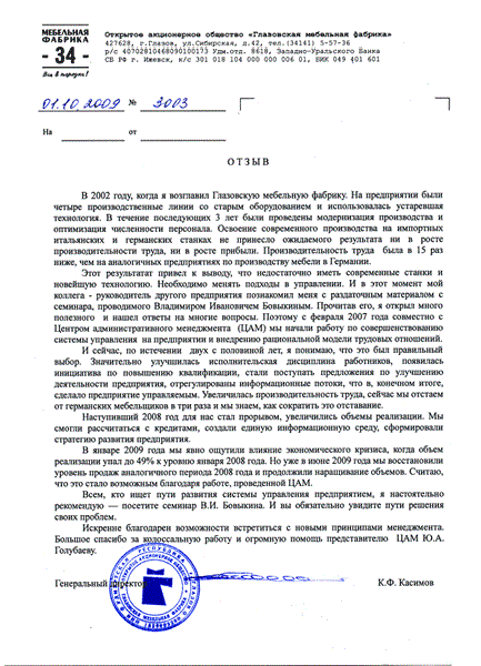Отзыв генерального директора ОАО «Глазовская мебельная фабрика» Касимова К.Ф. (2-ой отзыв)