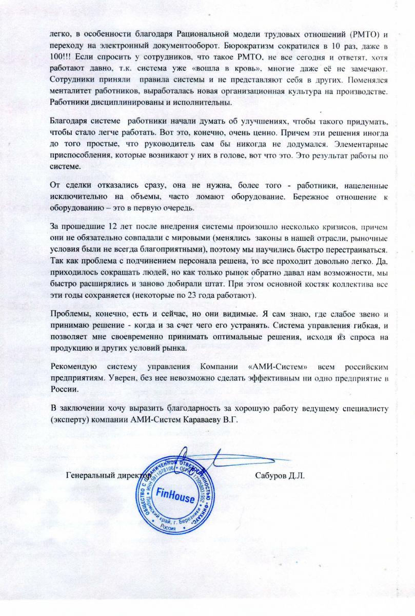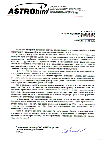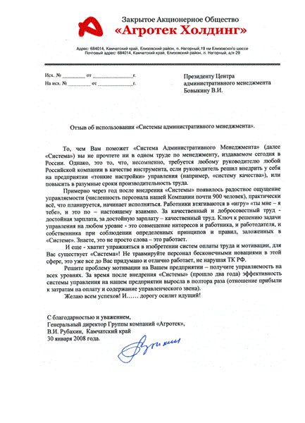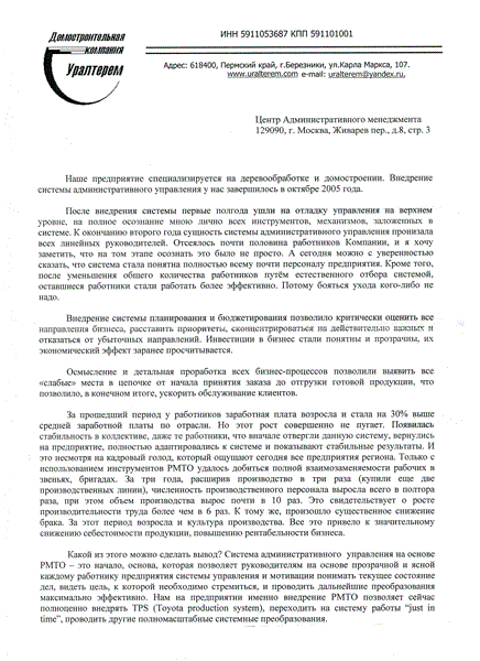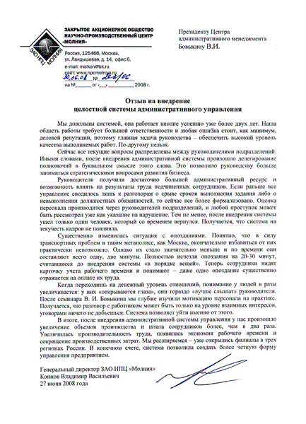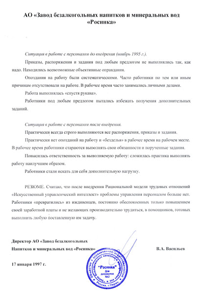 Этого количества достаточно, чтобы утверждать, что данная технология создания дисциплинированных высокопроизводительных трудовых коллективов тщательно отработана на практике, прошла надлежащую проверку и многократно доказала свою эффективность. Представим некоторые из отзывов руководителей предприятий сразу после внедрения, через год, два, ..., через десять лет и т.д.