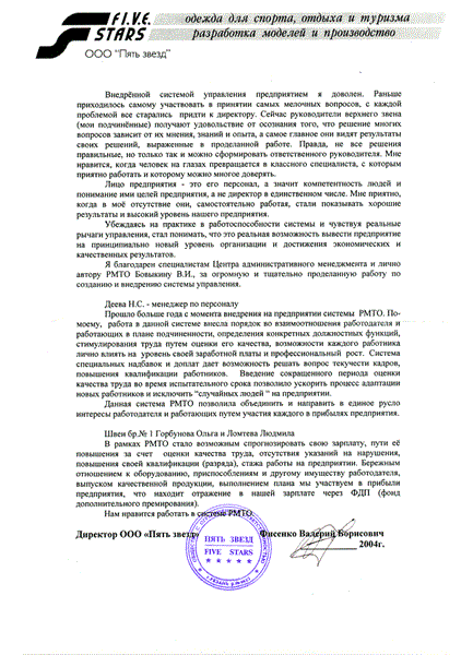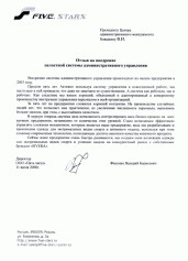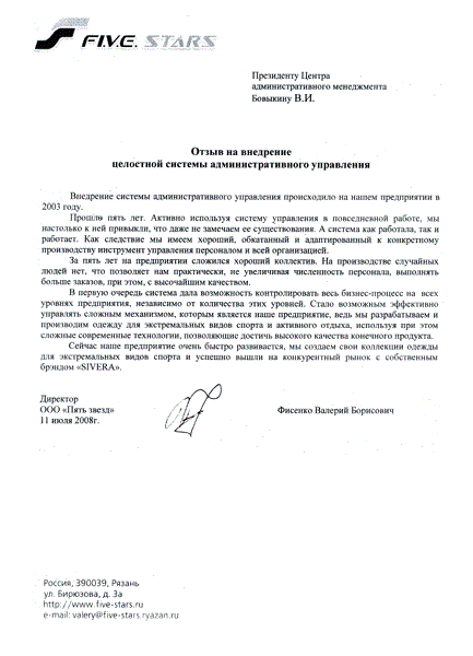 Отзыв директора ООО «Пять звезд» Фисенко В.Б.