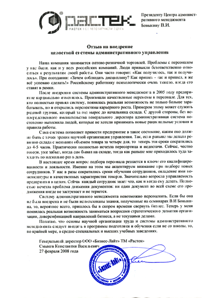 Отзыв генерального директора ООО «Бизнес-Лайт» ТМ "Растек" Смыкова К.В.