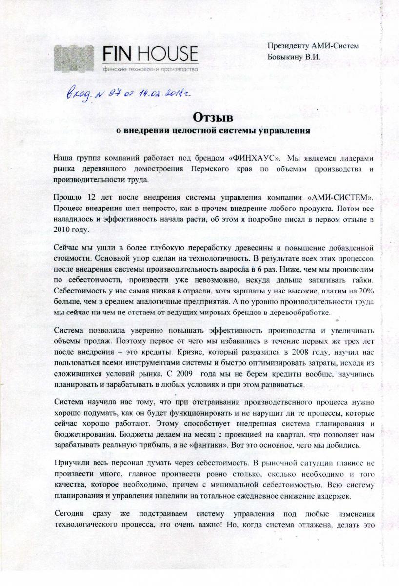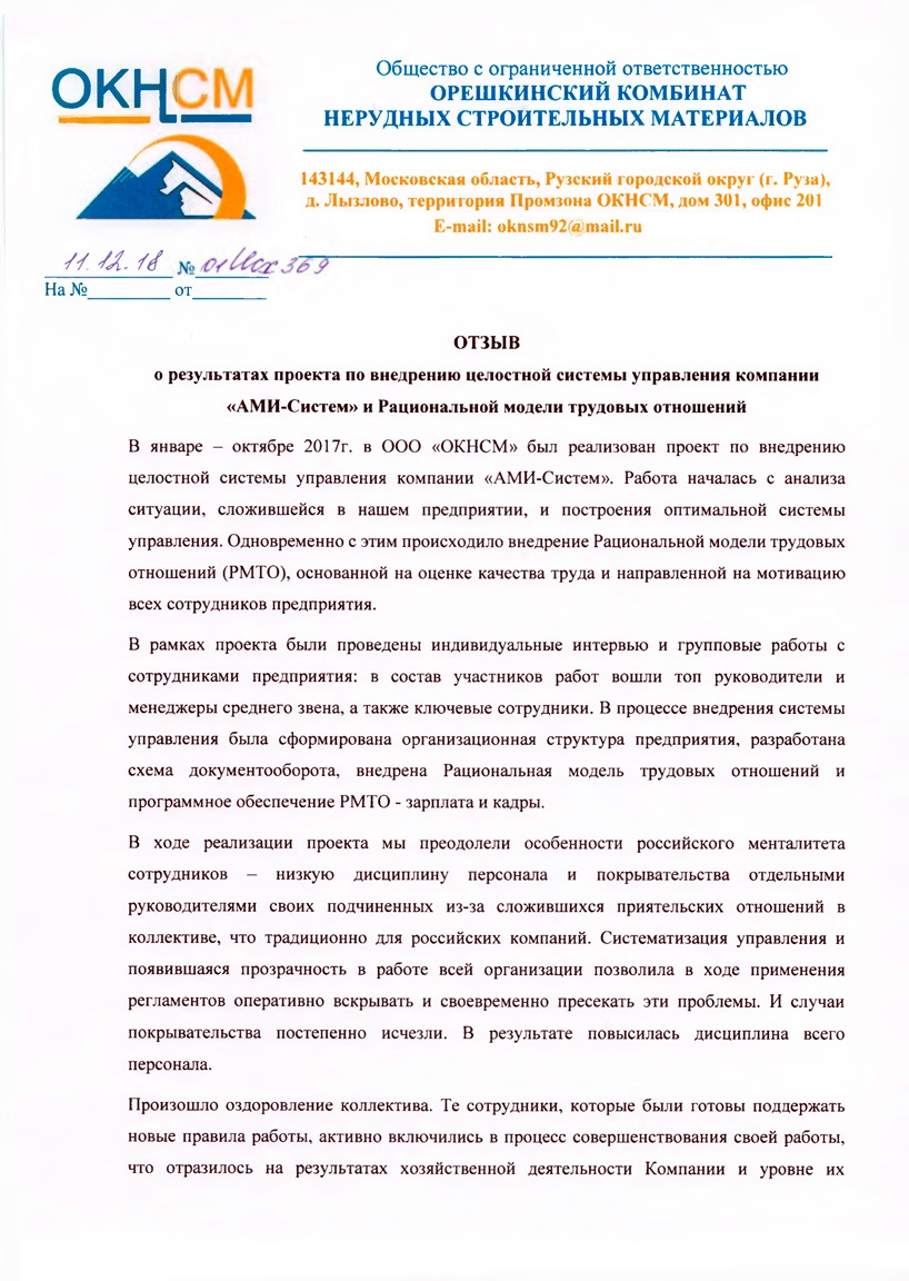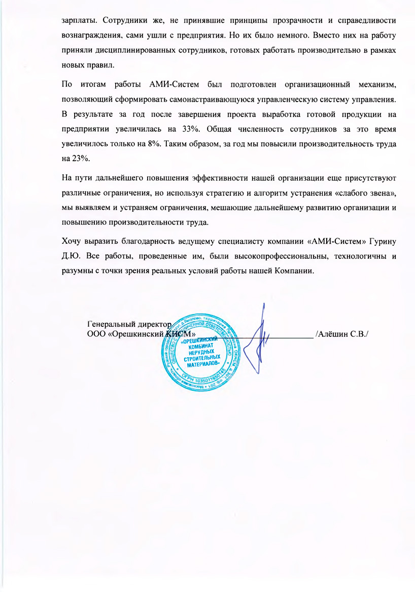 Полный отзывОтзыв Генерального директора ООО «Орешкинский комбинат нерудных строительных материалов» Алёшина С.В. о внедрении Целостной системы управления