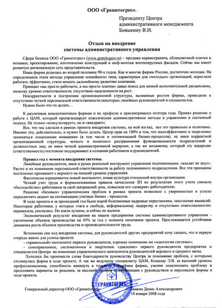 Отзыв генерального директора ООО «Гранитогрес» Ланкина Д.А.