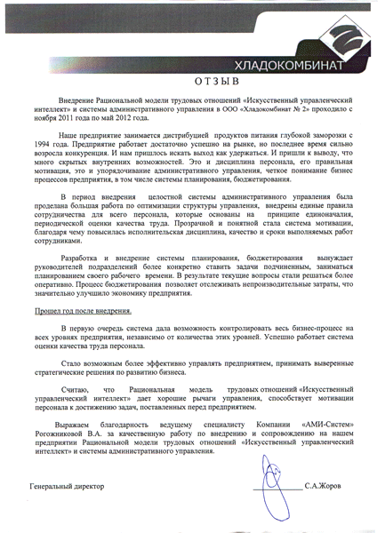Отзыв генерального директора ООО "Хладокомбинат №2" Жорова С.А.