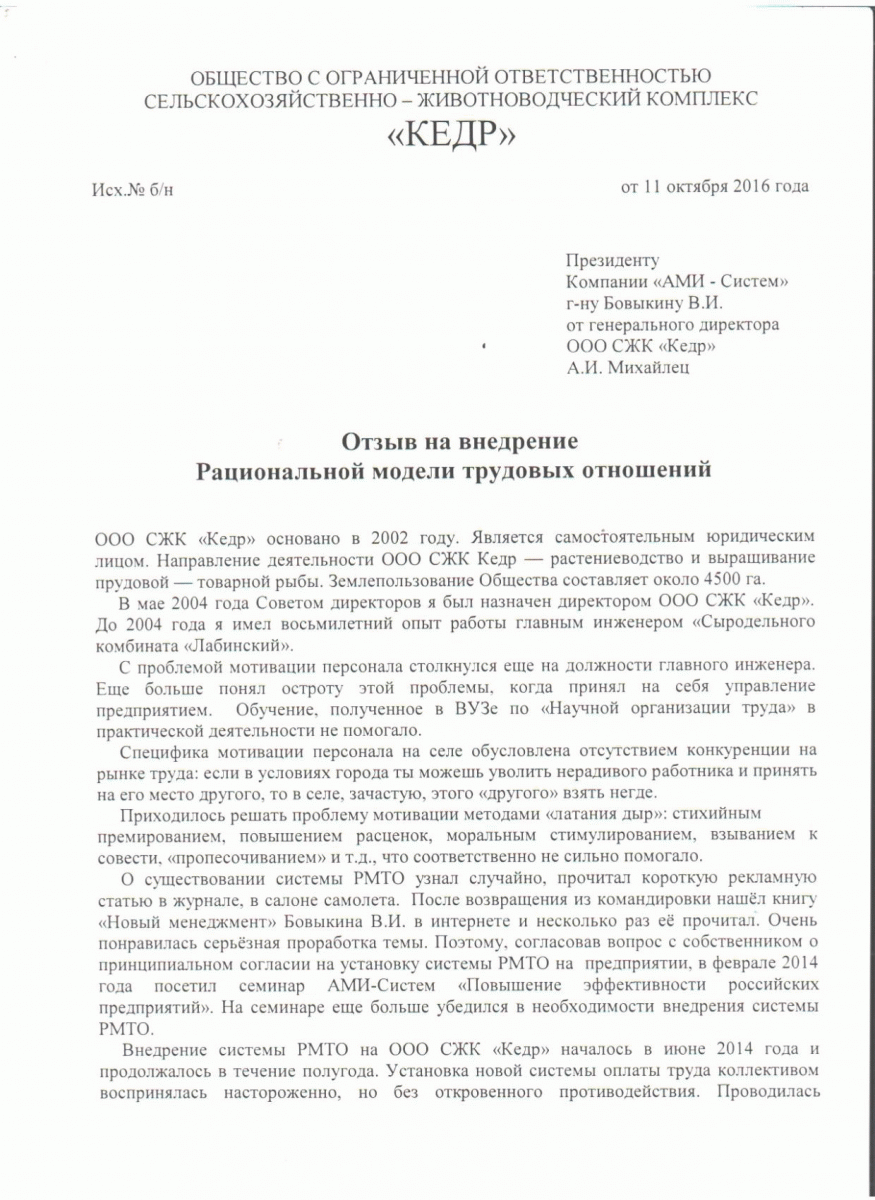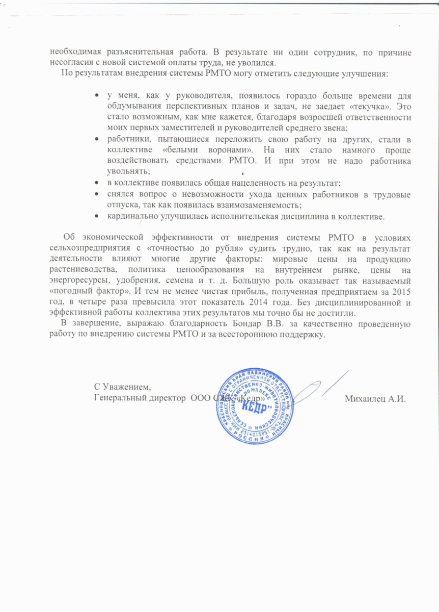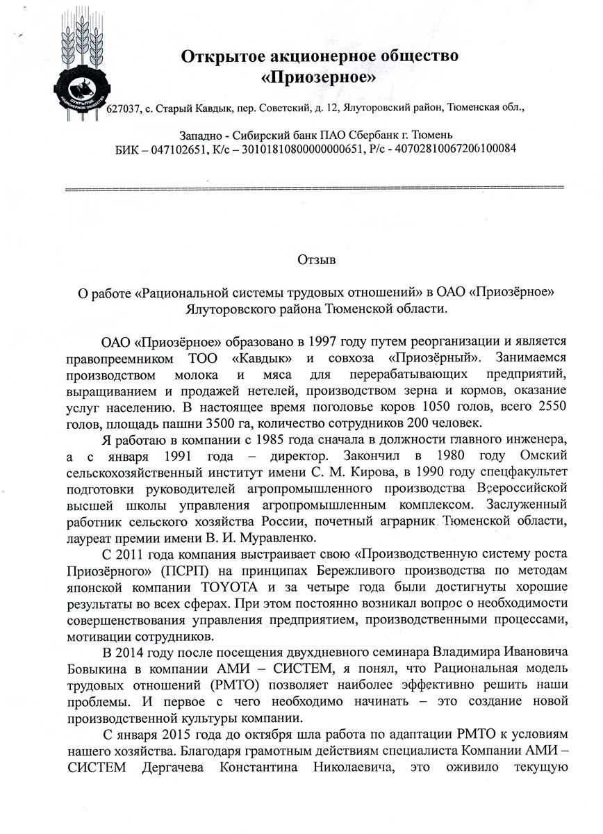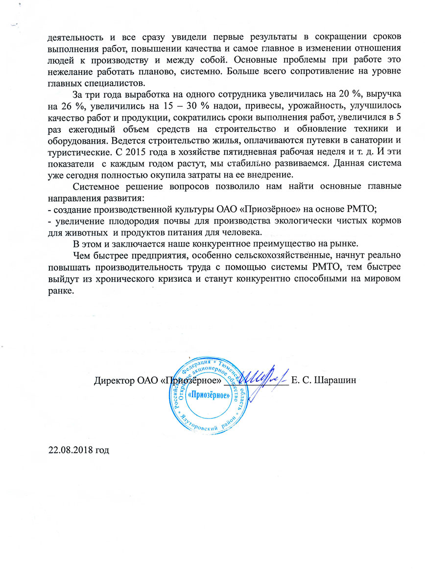 Отзыв директора ОАО «Приозёрное» Шарашина Е.С. о внедрении РМТО
