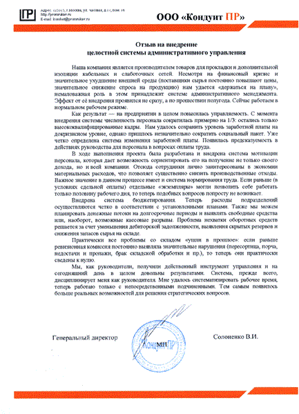 Отзыв генерального директора ООО «Кондуит ПР» Солоненко В. И.