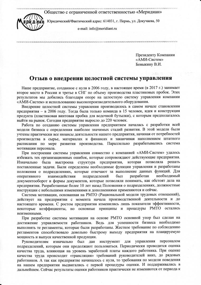 Отзыв Генерального директора ООО "МЕРИДИАН" Филиппова А.Ю.