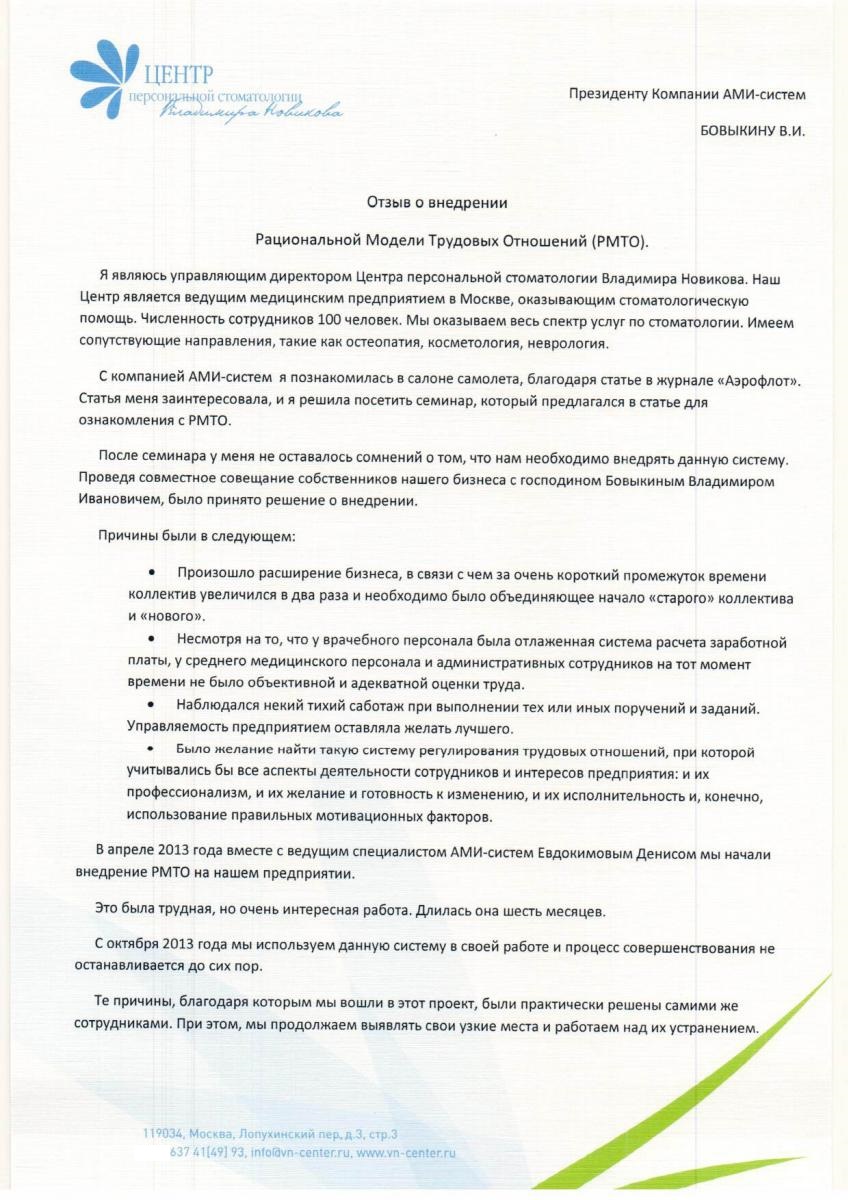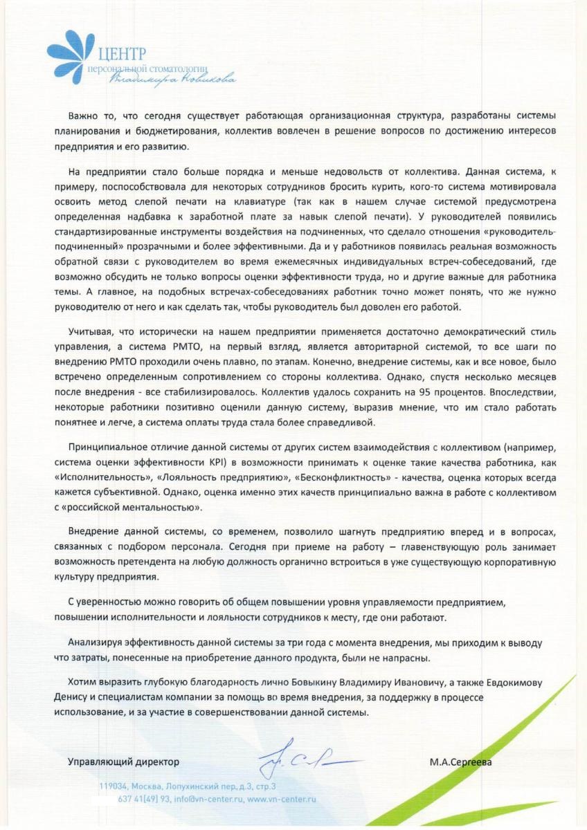 Отзыв управляющего директора Центра персональной стоматологии "Клиника Новикова" Сергеевой М.А.