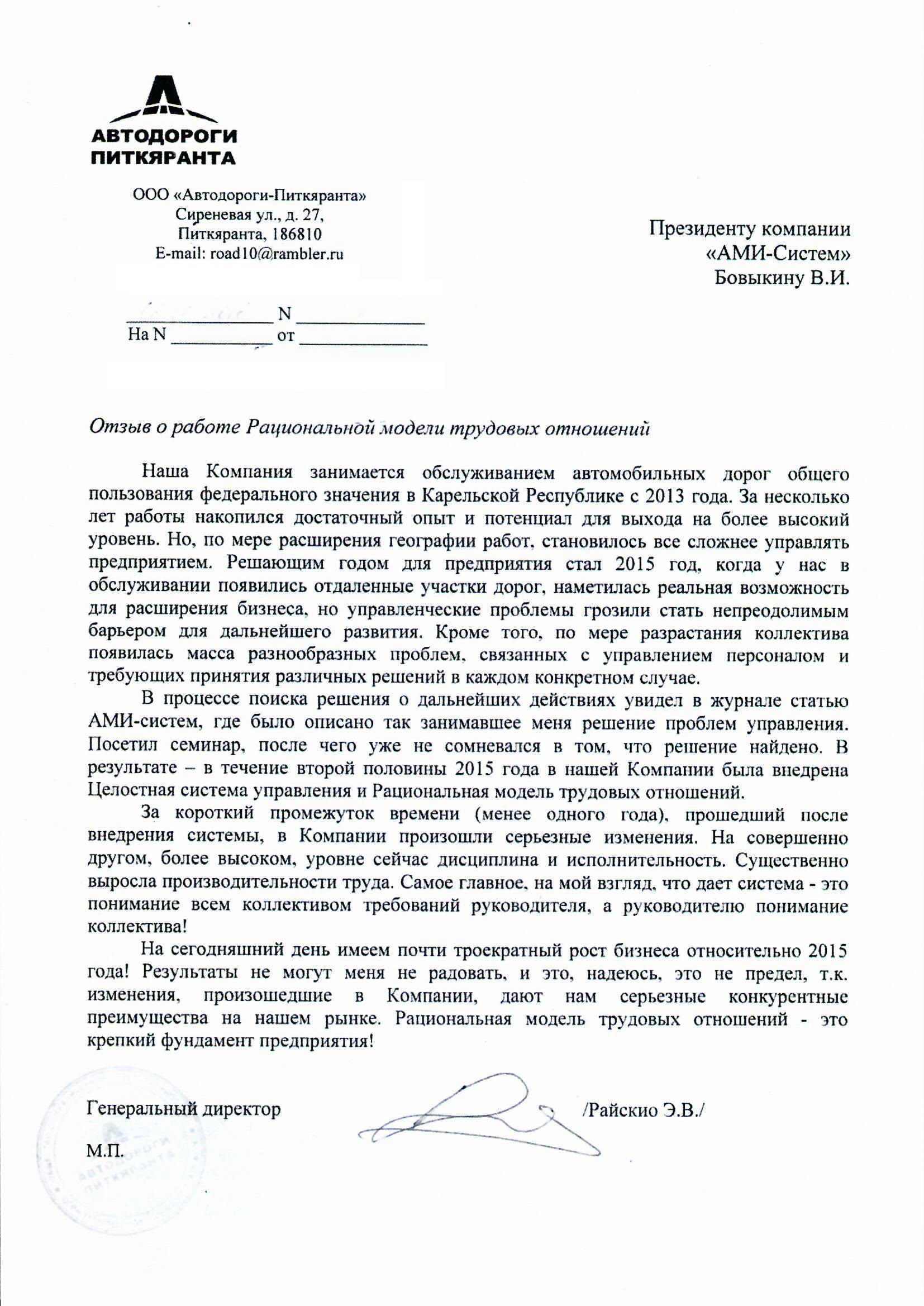 Отзыв генерального директора ООО "Автодороги-Питкяранта" Райскио Э.В.