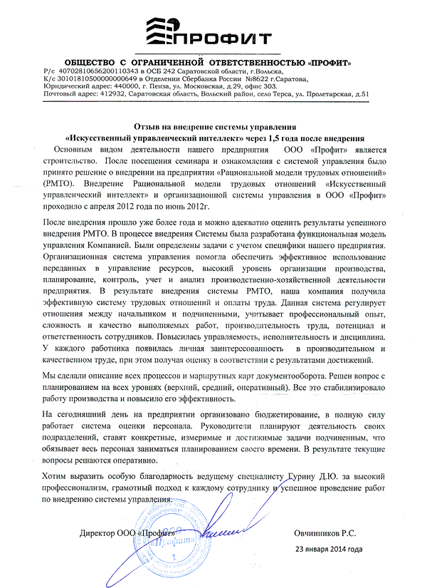 Отзыв директора ООО "Профит" Овчинникова Р.С.