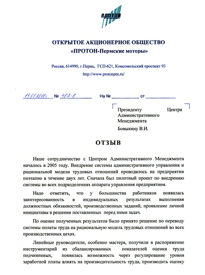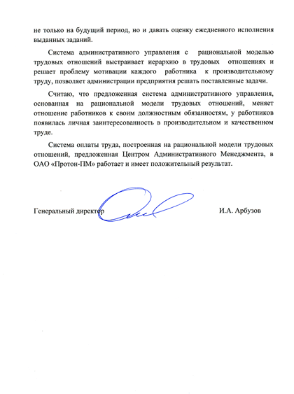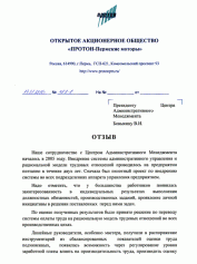 Отзыв генерального директора ОАО «ПРОТОН-Пермские Моторы» Арбузова И.А.