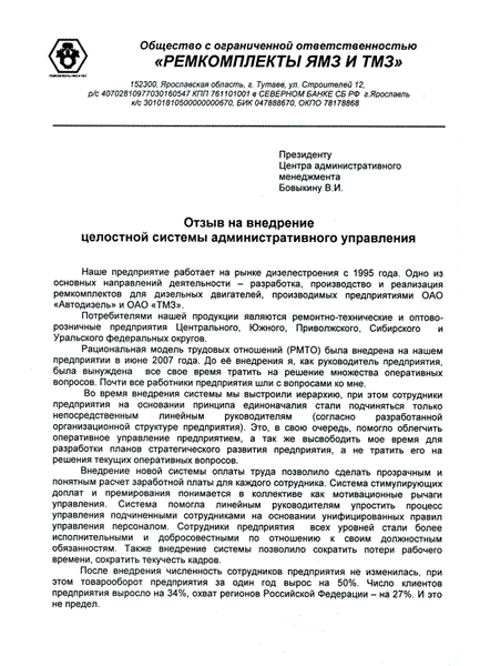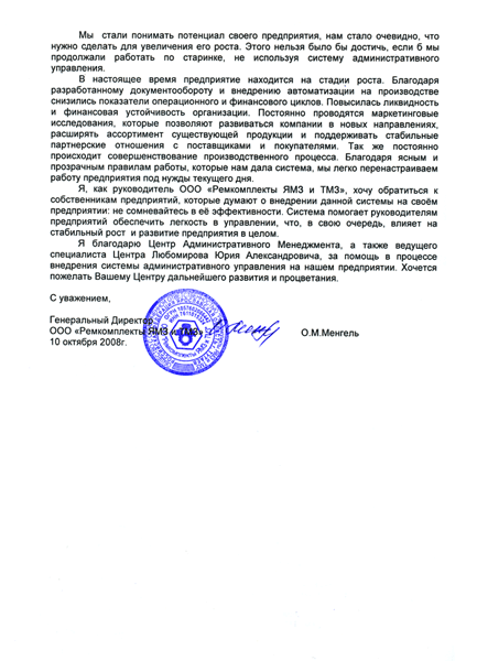 Отзыв генерального директора ООО «Ремкомплекты ЯМЗ и ТМЗ» Менгеля О.М.