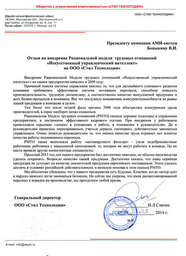 Отзыв генерального директора ООО "Стил Технолоджи" Слатина И.Л.