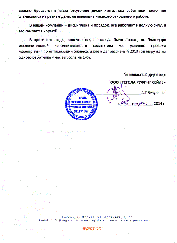 Отзыв генерального директора ООО "ТЕГОЛА РУФИНГ СЕЙЛЗ" Безусенко А.Г.