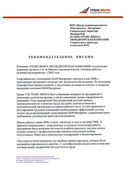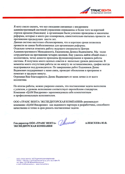 Отзыв генерального директора ООО «ТРАНС ВЕНТА» Алексеевой Ю.В.