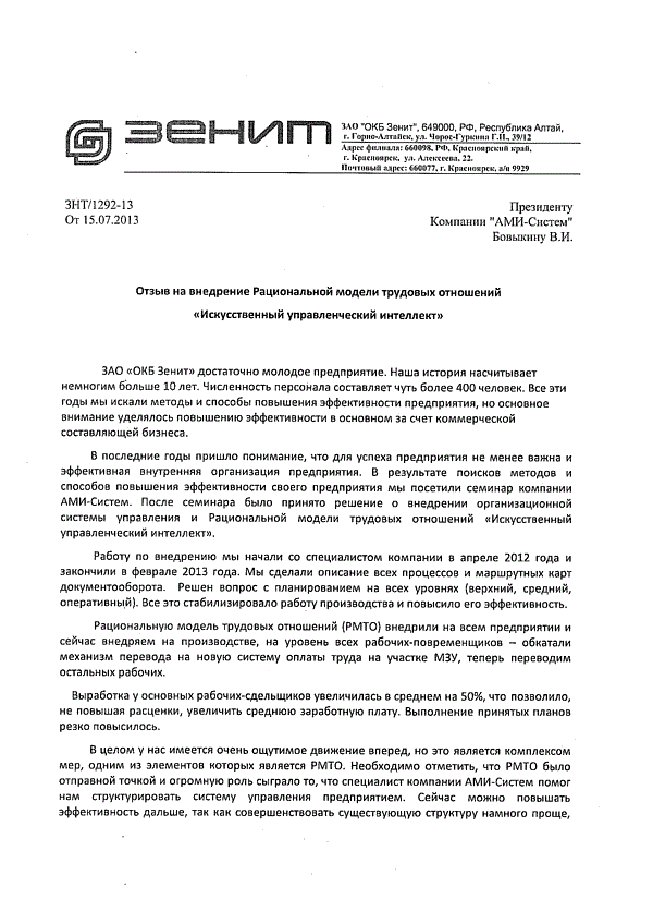 Отзыв генерального директора ЗАО "ОКБ Зенит" Шорикова Д.Б.