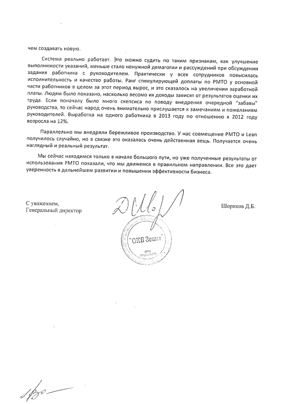 «Система работает. Выработка у основных рабочих-сдельщиков увеличилась в среднем на 50%. Практически у всех повысилась исполнительность и качество работы...»
